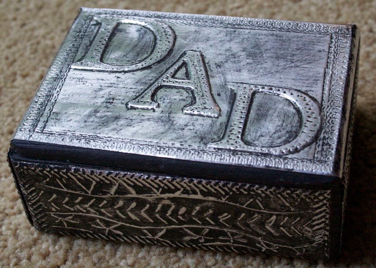 The photos are of a box I made for my son to give to his Dad for Father's Day. It was covered with metal and decorated using ten second studio tools, some cardstock letters, my cuttlebug and black acrylic paint.